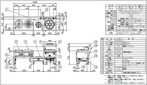 4口レンジ 【外形寸法】間口2250×奥行750×高さ720×バック230mm 【釜配置】ギョーザ、イタメ、スープ、ゆで麺 【ガス消費量】都市ガス65.1kW 56300kcal/h、LPガス65.1kW 4.67kg/h 【ガス接続口】32A 【給水口】15A 【排水口】40A×2 ※ゆで麺は瞬間給湯式。
