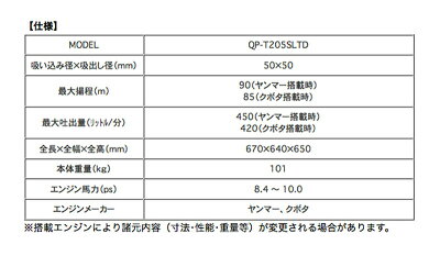 【代引不可:受注後2週間かかります】 2インチ高圧ポンプ(空冷ディーゼルエンジン) QP-T205SLTD ヤンマー エンジン 【特長】 1.空冷ディーゼル付き高圧型ポンプシリーズ 2.ダブルインペラー採用の超高圧型ポンプ 【用途】 ■高所・遠距離への給排水(デイーゼルエンジン駆動)。